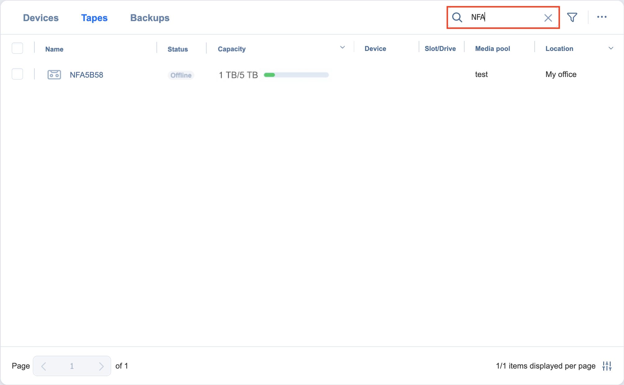 You can search for a specific tape cartridge by entering its name (or part of its name) into the Search box. The table will dynamically change to display the search results matching your query.