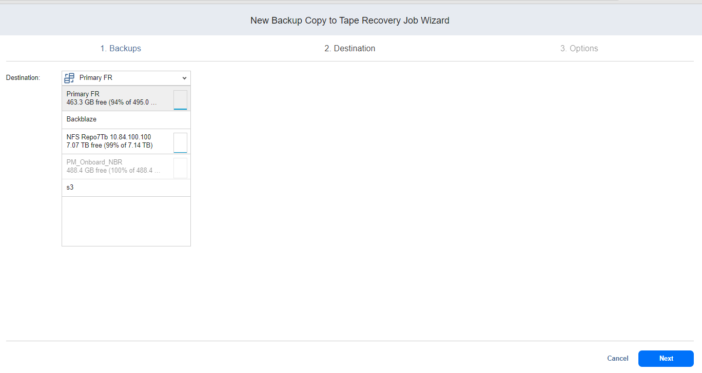 Backup Copy to Tape Recovery jobs can copy backups from one Backup Repository to another. Select a target Backup Repository as described below: