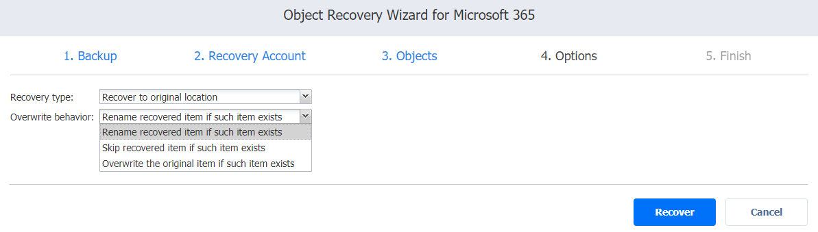 Select Recover to original location from the Recovery type drop-down list. All selected items will be recovered to their original locations within the Microsoft 365 account. This option is disabled if a mailbox, OneDrive, or site no longer exists (deleted from the product, for example) or if you have selected a recovery account on the Recovery Account page of the wizard that is different from the original account.