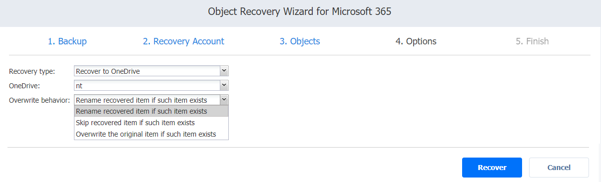 Select Recover to OneDrive from the Recovery type drop-down list.