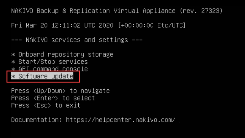 In the VA menu, select Manage NAKIVO services and press Enter.