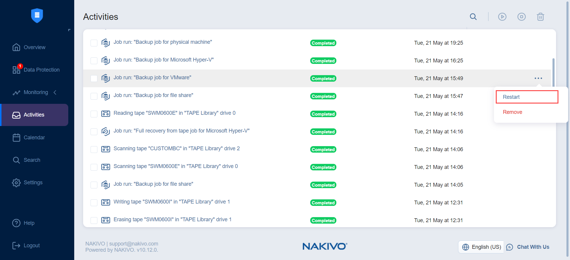 The Activities page displays current and past tasks performed by NAKIVO Backup & Replication. From this dashboard, the following actions can be done: