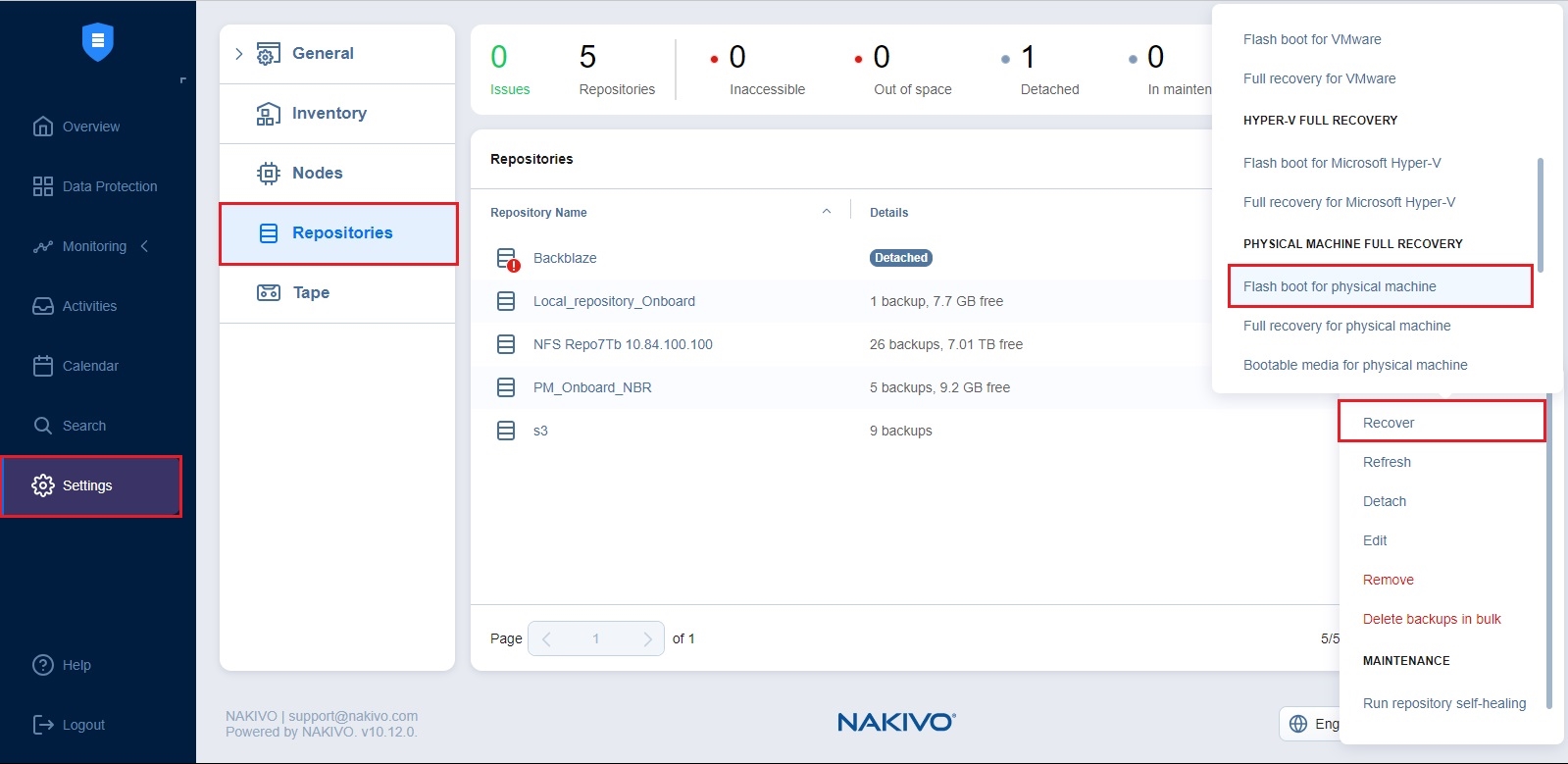 Create a Flash boot job from the Data Protection menu by clicking Recover and then selecting Flash boot for physical machine.