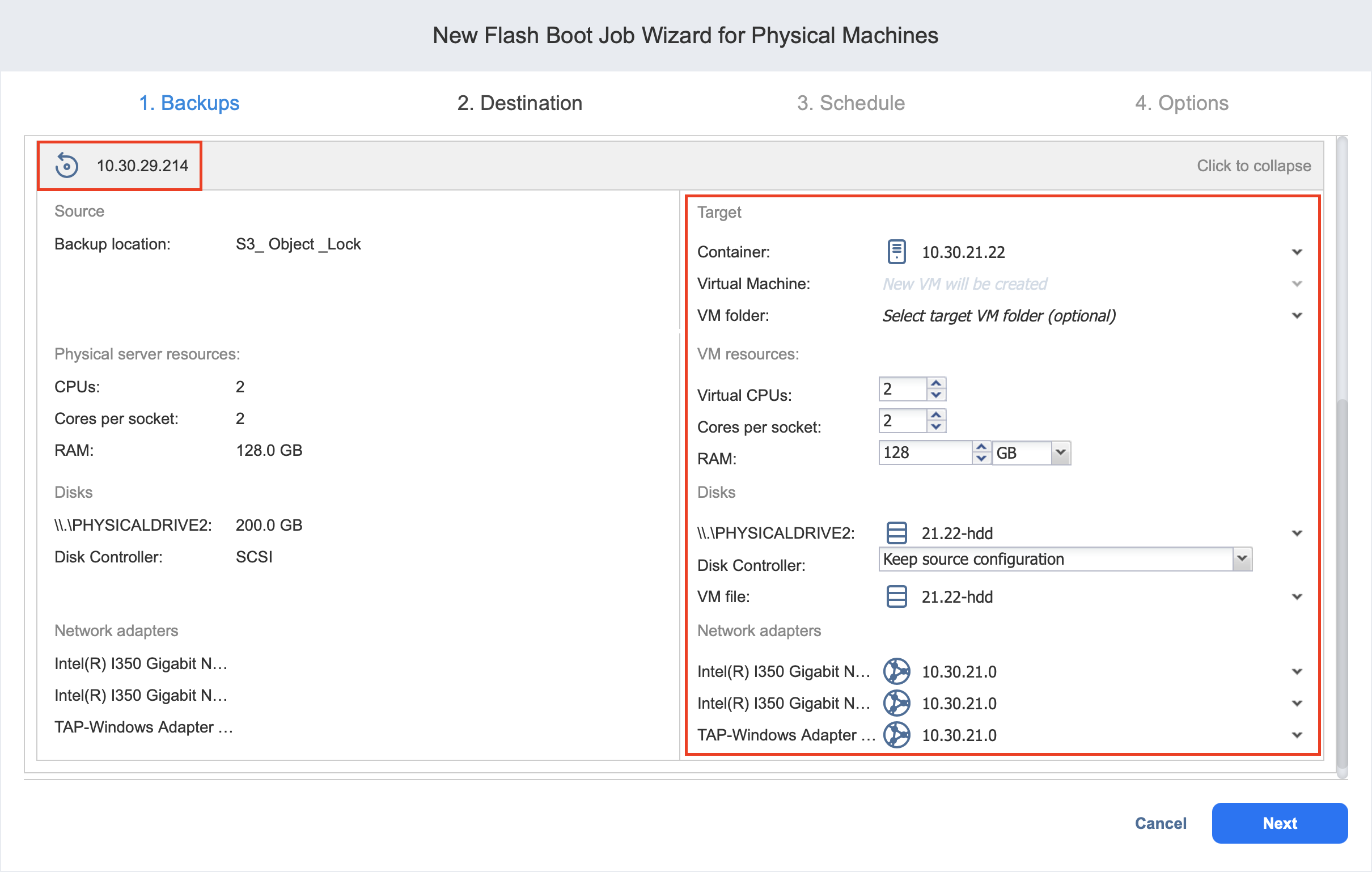 Flash Boot Job Wizard for Physical Machine: Destination