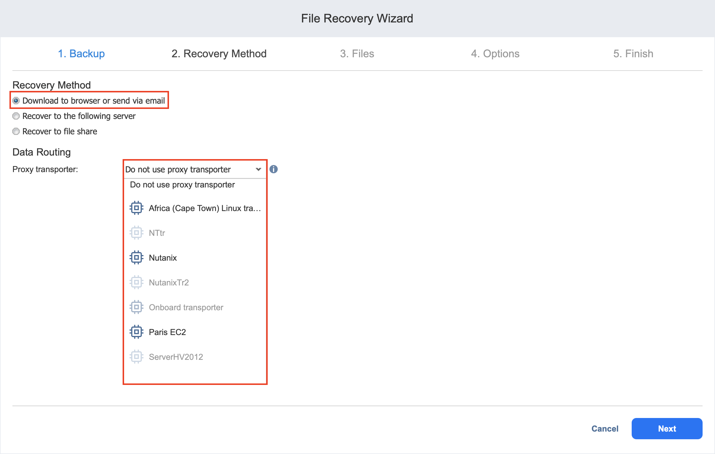 The Data Routing section is displayed. In the Proxy transporter drop-down list, select the target server where the recovery point is mounted. This proxy transporter is used instead of the source transporter to communicate with the assigned transporter at the recovery server for data processing of the selected backup.
