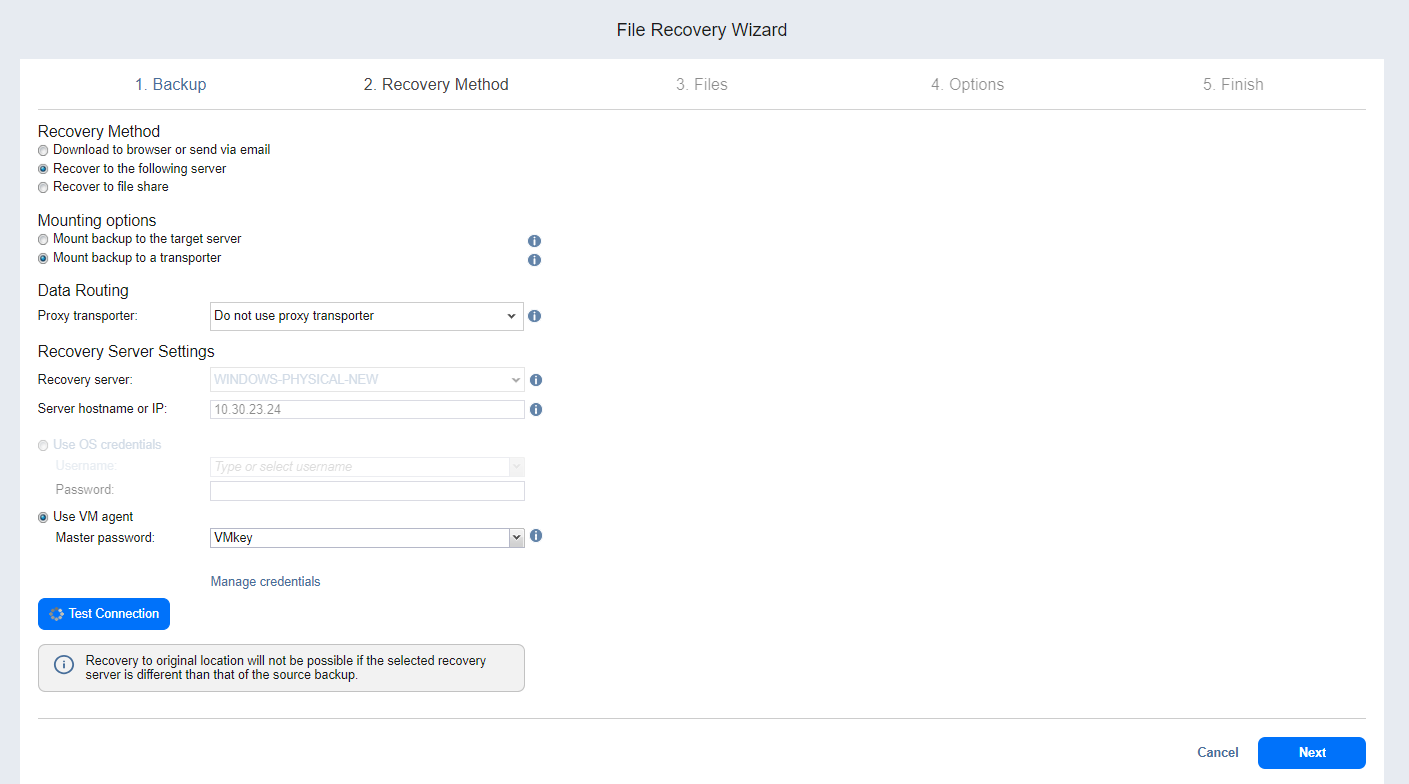 Select the Use VM Agent option to recover the files through the Permanent Agent. The product automatically fills out the Master password if the Permanent Agent is detected from the selected recovery server.