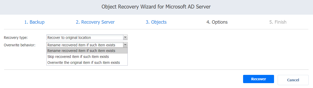 In the Overwrite behavior list, select what needs to be done if the recovered item conflicts with an existing item. Refer to the section above for an explanation.