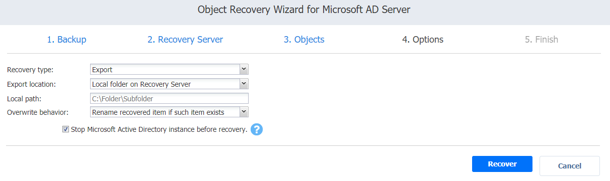 ntds.ditfile) on the Recovery Server pageput a checkmark in theStop Microsoft Active Directory instance before recovery checkbox to stop the instance before the recovery process begins.This option is recommended for the safe recovery of Active Directory objects.