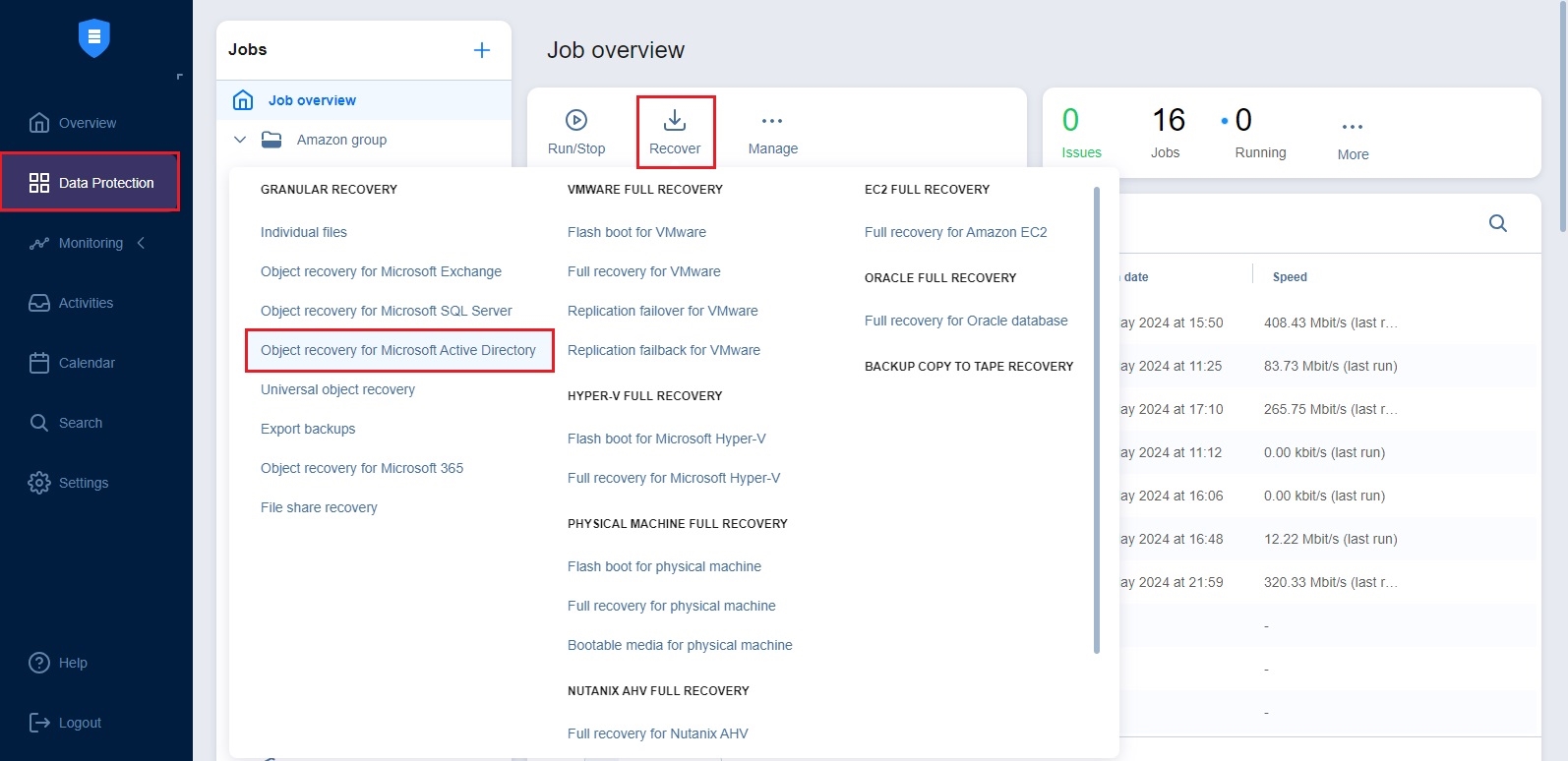 To start Active Directory Object Recovery from the Data Protection menu, click Recover and then choose Object recovery for Microsoft Active Directory.