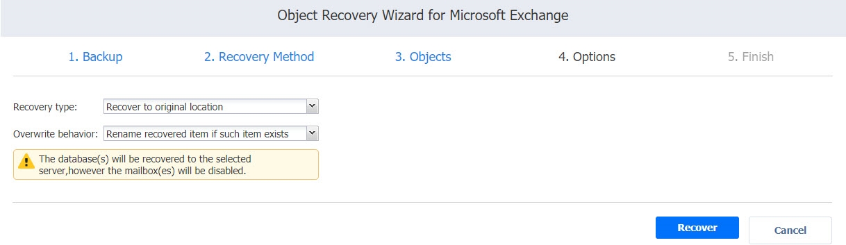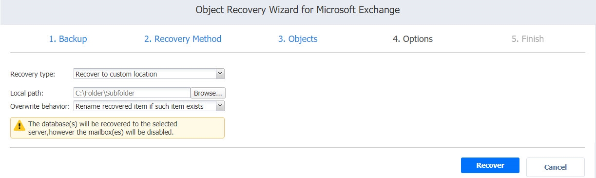 On the Options page, specify the location for recovered objects and define overwriting options and naming conventions.