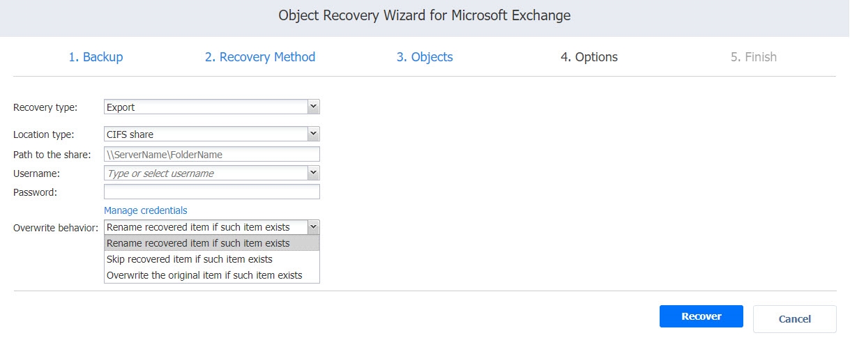 In the Recovery type drop-down list, you can choose Export to export Microsoft Exchange. You can choose the following locations for the export: