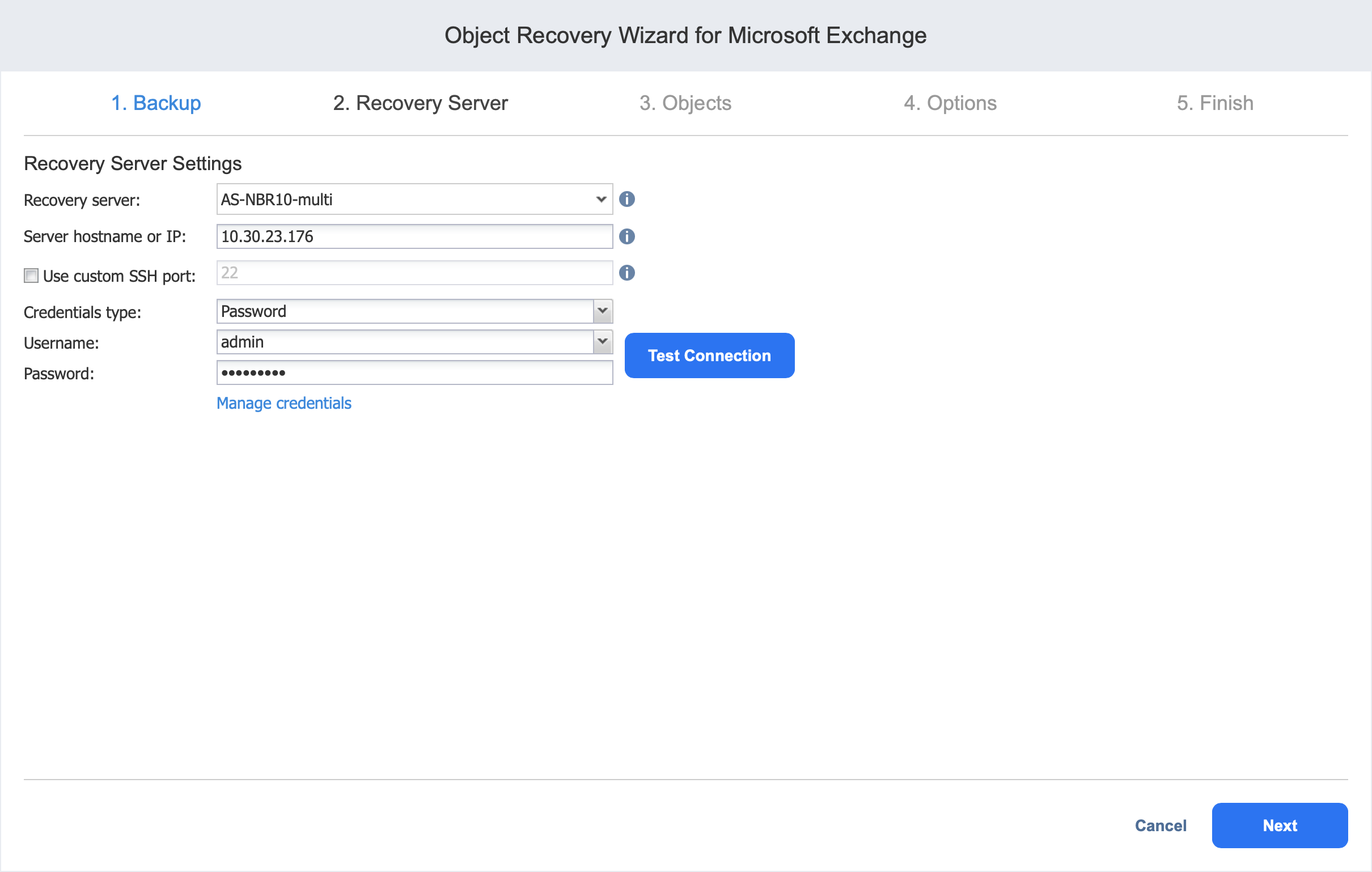 Server IP address: Displays the automatically detected IP address of the server to which the objects must be recovered. You'll need to enter the IP address of the recovery server manually if autodetection fails or if you did not select anything in the previous parameter.