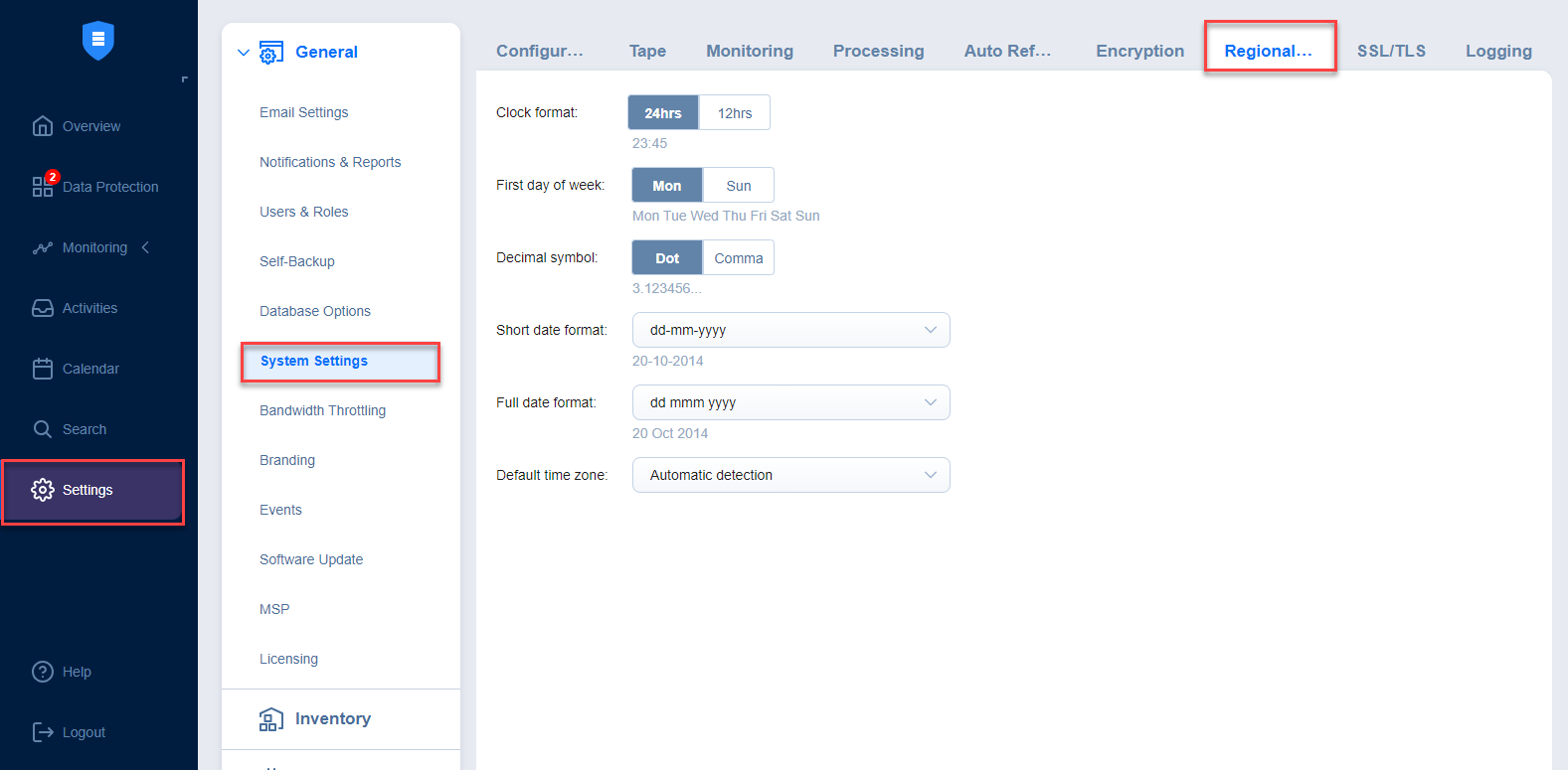 To customize the first day of the week, go to the Settings > General tab > System Settings > Regional Format tab and select the needed day in the First day of week selector.