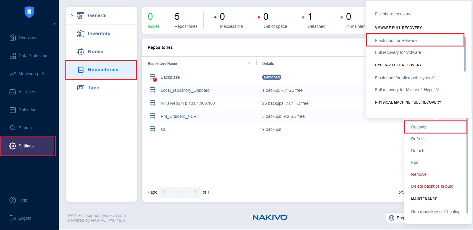 Click the ellipsis Manage button, click Recover, and select Flash boot for VMware under VMware Full Recovery.