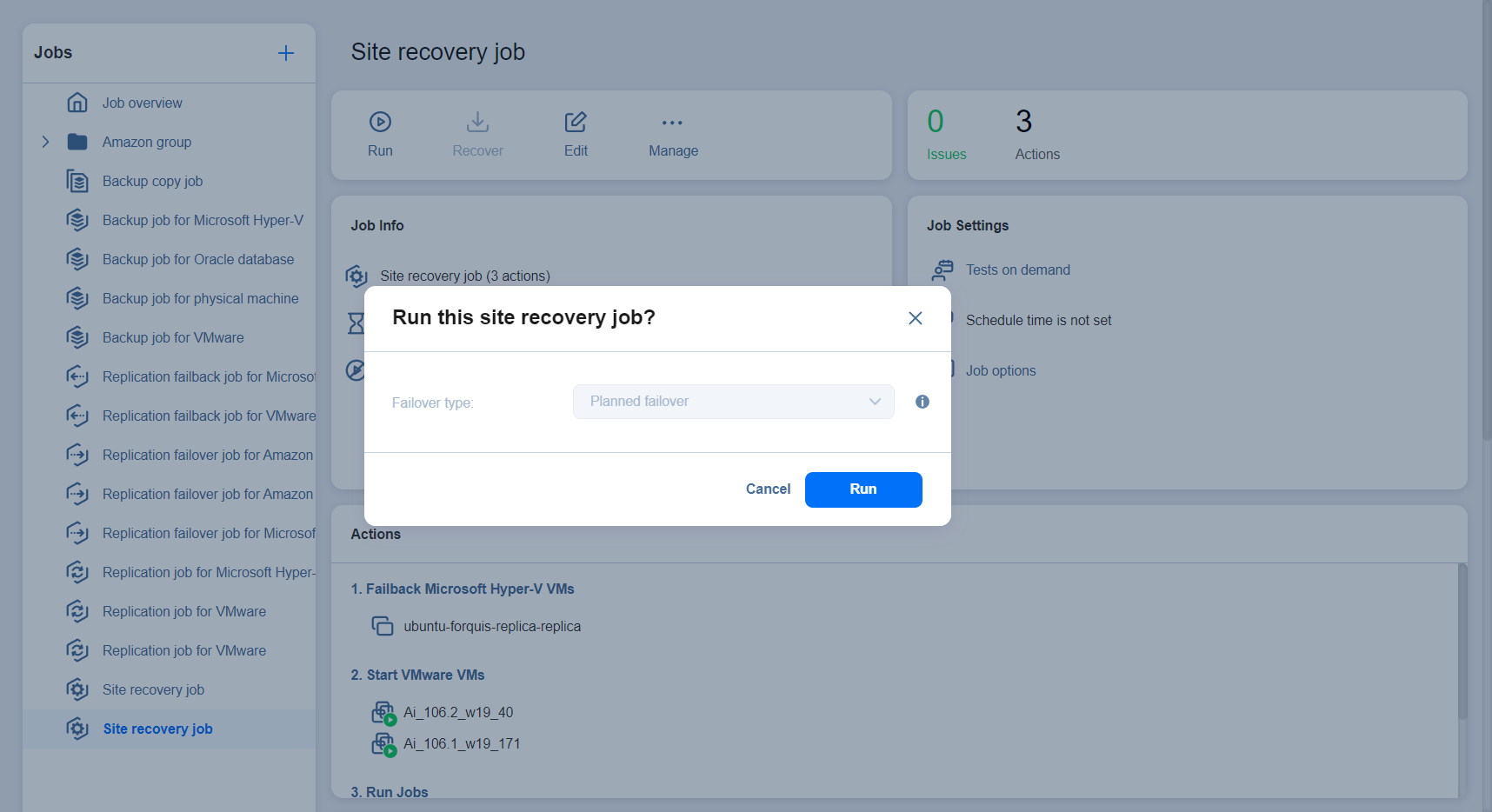 In the Jobs menu, select your site recovery job and then click the Run button.