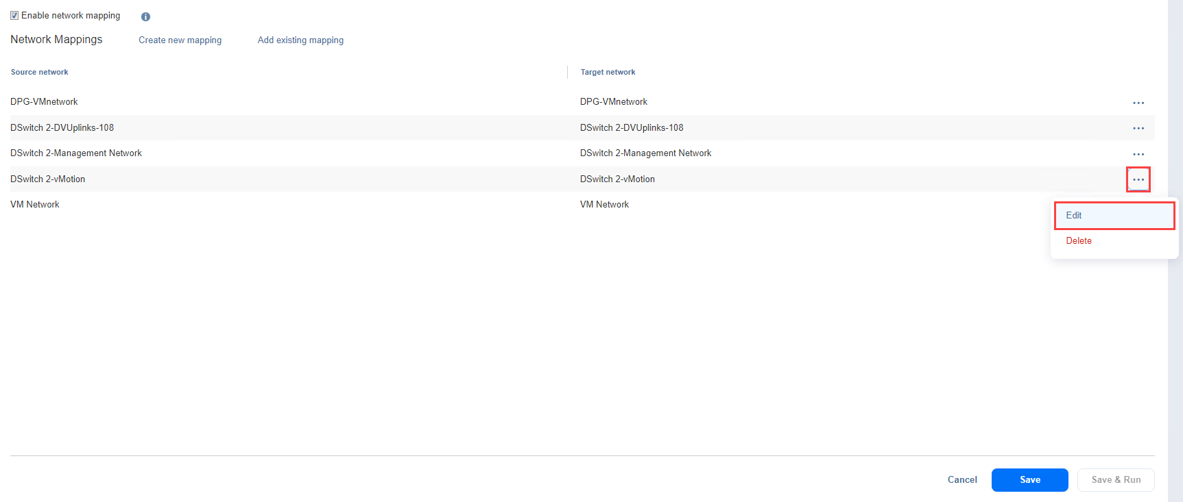 Delete an existing mapping: Hover the pointer over the required item in the Network Mappings list and click the ellipsis Manage button to the right of the item. Then, click Delete.