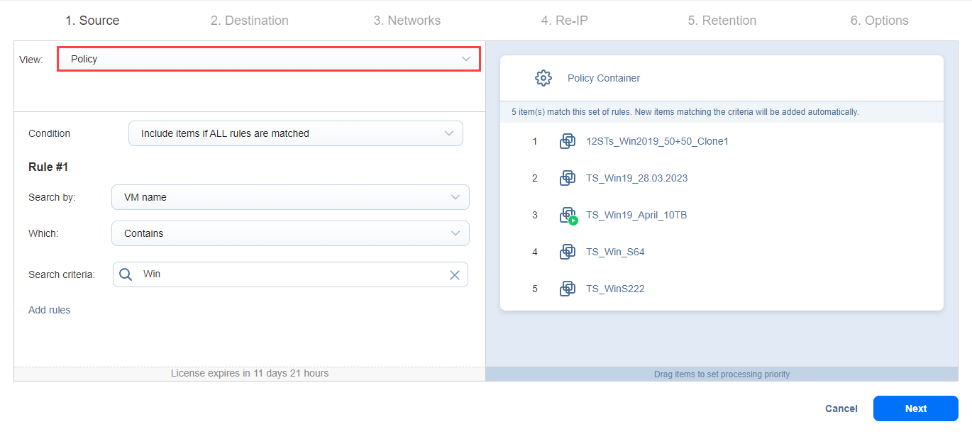 On the Source page of the wizard, select one of the views to add VMware items to your real-time replication job for VMware.