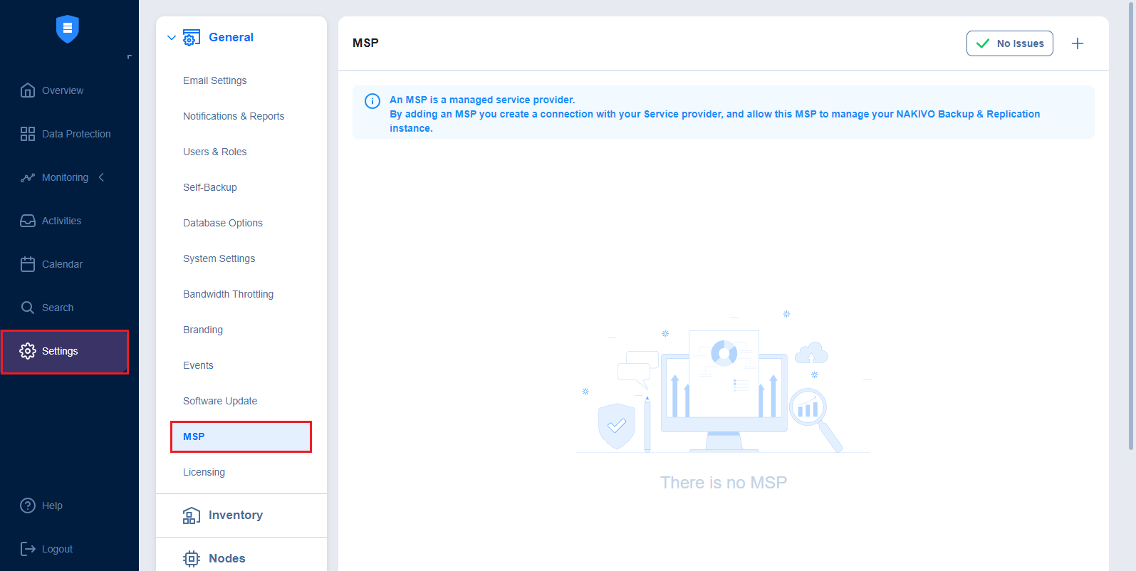 To allow an MSP to manage your standalone instance of NAKIVO Backup & Replication, you need to link your instance to the MSP’s instance of the solution. To do so, you should first add and configure the MSP details on the MSP page in Settings. These details can be provided by the MSP after Remote Tenant Configuration.
