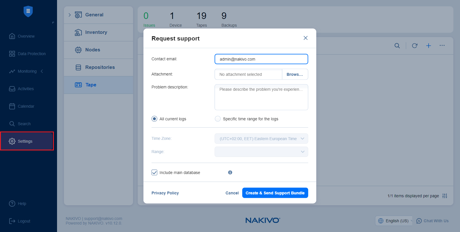 NAKIVO Backup & Replication provides you with the ability to create support bundles – a zipped collection of the product logs and system information. Sending a support bundle to the NAKIVO Support Team allows them to quickly identify the root cause of issues and suggest a proper solution.