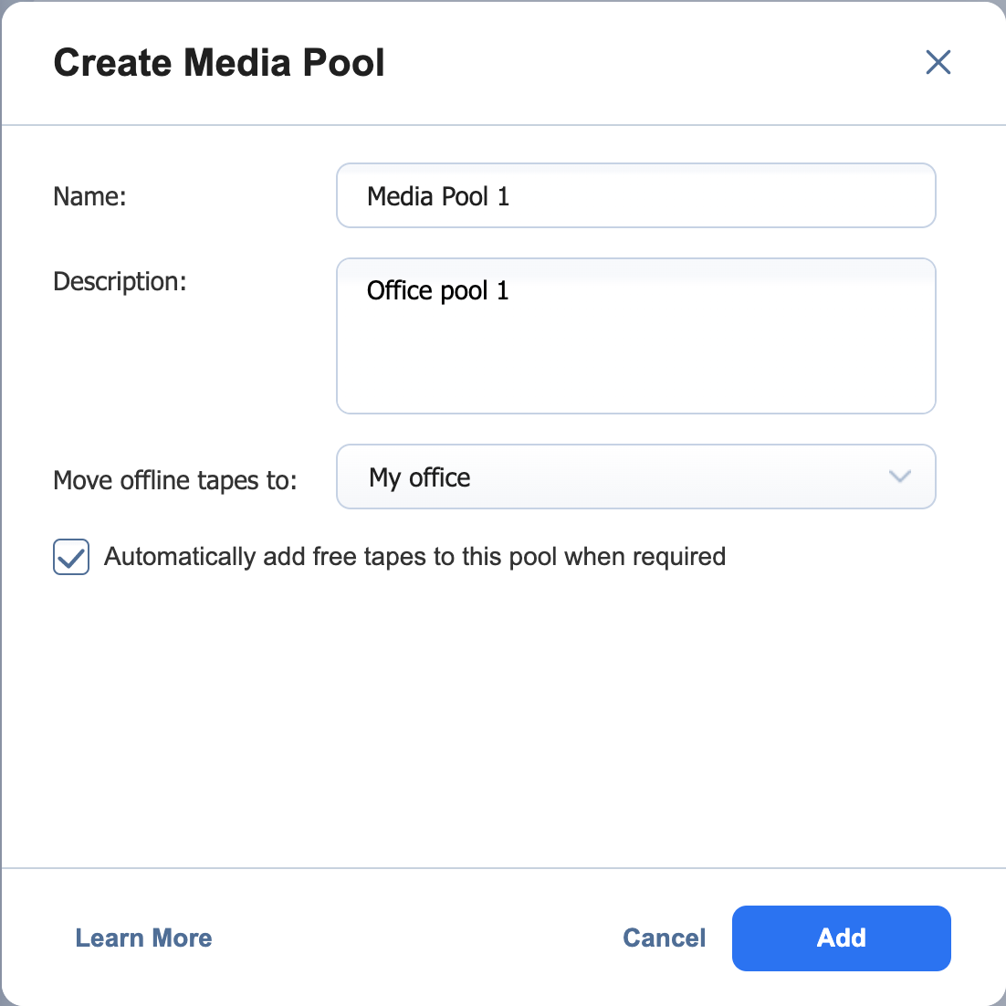 Select the Automatically add free tapes to this pool when required checkbox to automatically add one of the empty available tape cartridges to this media pool if the media pool does not have available tape cartridges.